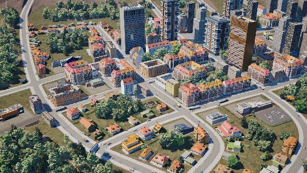 Various city buildings and many stores in different sizes over several time periods and categories (food, fashion, home decoration/furniture, hardware store, electronics).